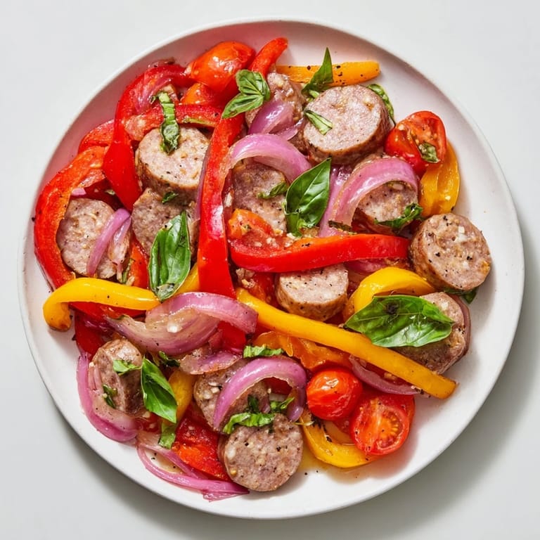 Save A vibrant, quick one-pan meal featuring juicy sausage, sweet bell peppers, and a burst of fresh basil for a flavor-packed weeknight dinner.
