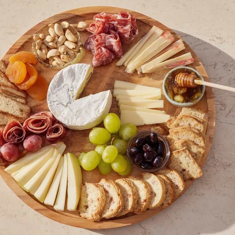 Creating a charcuterie board that feels intentional rather than haphazard comes down to understanding contrast and balance. Think in terms of color: the deep blues of the cheese against the golden prosciutto, the emerald pistachios next to the ruby grapes. Think in terms of texture: the creamy softness of Brie against the firm snap of a cracker. Think in terms of flavor: sweet apricots paired with salty almonds, tangy goat cheese balanced by the richness of coppa. When you arrange with these relationships in mind, the board tells a story instead of just offering options.