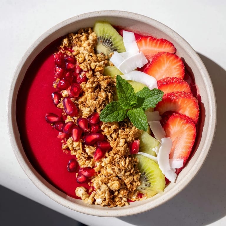 - Toppings: 1/2 cup granola (gluten-free if needed), 1/4 cup fresh pomegranate seeds, 1/2 kiwi sliced, 1/4 cup sliced strawberries, 2 tablespoons shredded coconut, Fresh mint leaves (optional)