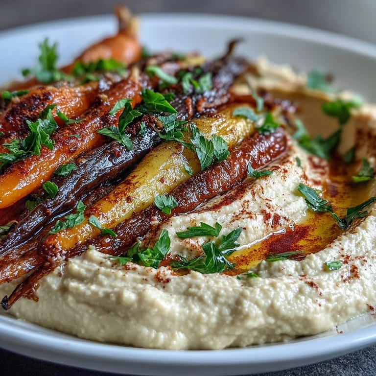 Save Brighten up your table with this vibrant platter of oven-roasted rainbow carrots and creamy homemade hummus. This Mediterranean-inspired dish features sweet, caramelized carrots served alongside a rich, tahini-based dip, making it a perfect healthy appetizer or colorful snack for any occasion.
