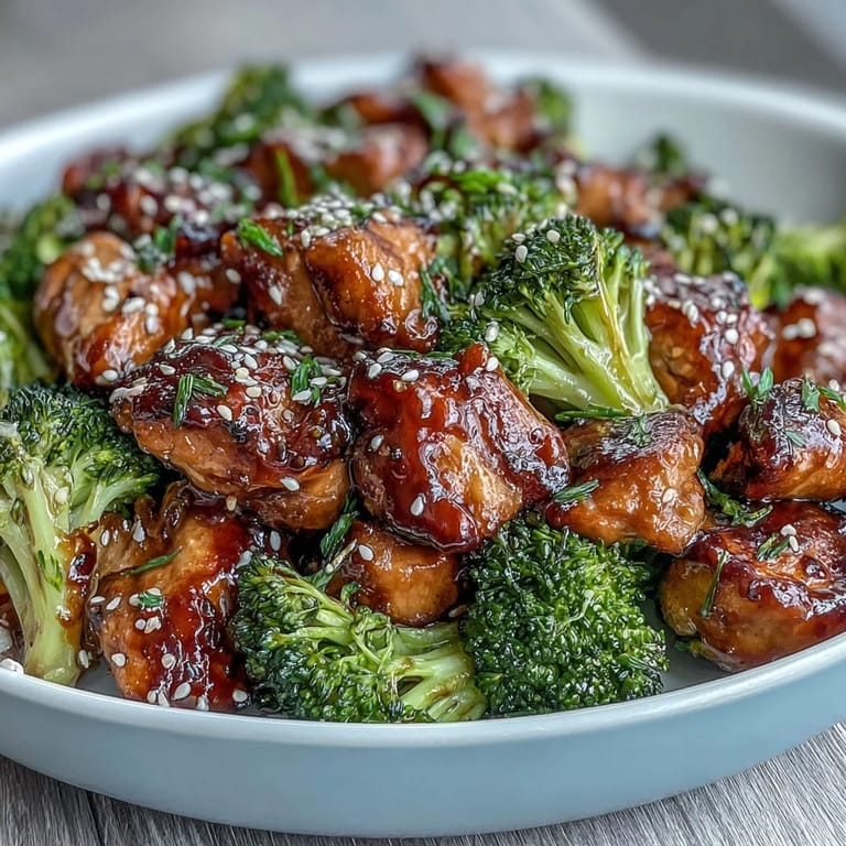 The chicken should be pale and opaque inside with no pink, though a quick internal thermometer reading of 165°F takes the guesswork out completely. The broccoli should have dark, caramelized edges and bend easily when you poke it, but still have a tiny bit of resistance—overcooked broccoli loses its personality. The sauce will have thickened noticeably and clings to everything rather than pooling at the bottom of the pan, which is exactly what you want.