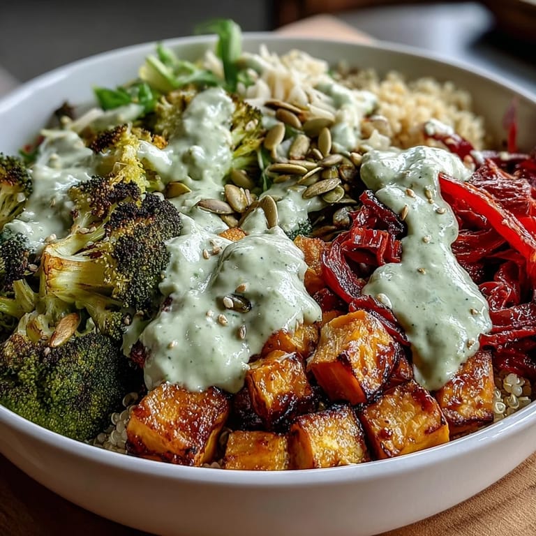 Save Experience a burst of color and nutrition with this Vegan Roasted Veggie Buddha Bowl. This dish combines the earthy sweetness of roasted sweet potatoes and bell peppers with the crunch of broccoli and zucchini, all served over a bed of fluffy quinoa. The star of the show is the creamy Green Goddess Avocado Dressing, which brings every element together with its fresh, herby vibrance.